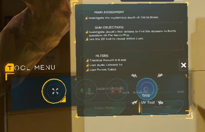 - Example of the UVtool, where the player can see otherwise invisible element to gain information and evidence from the crime scene